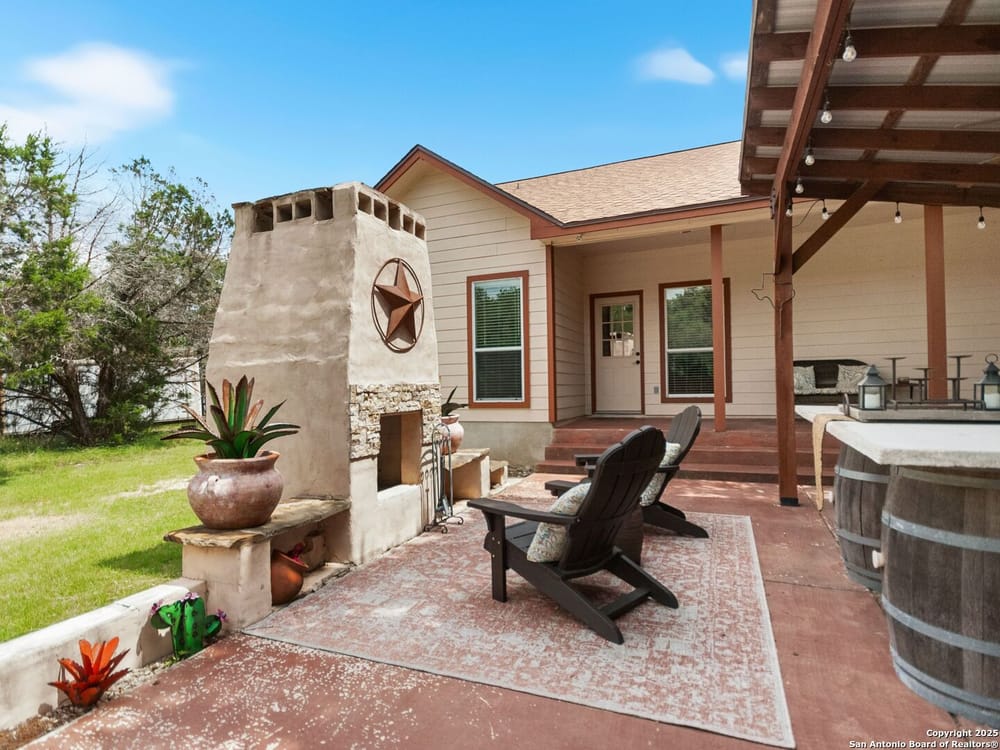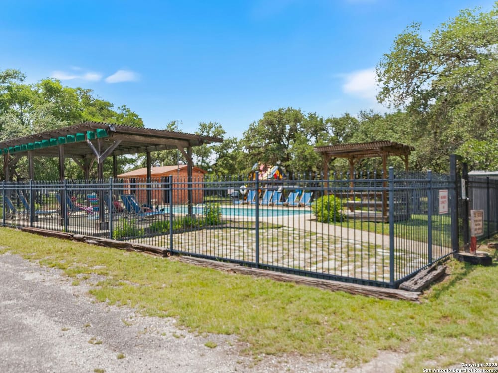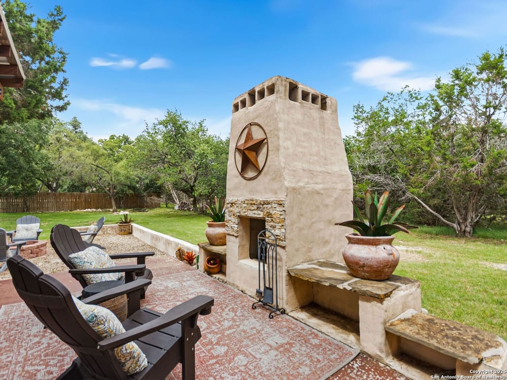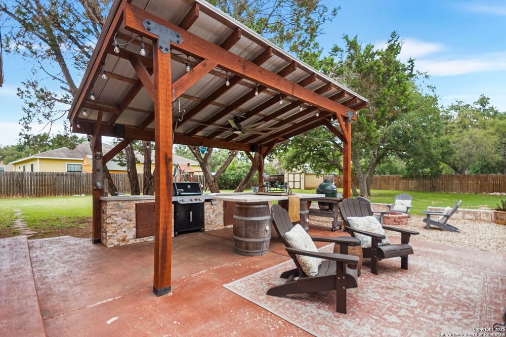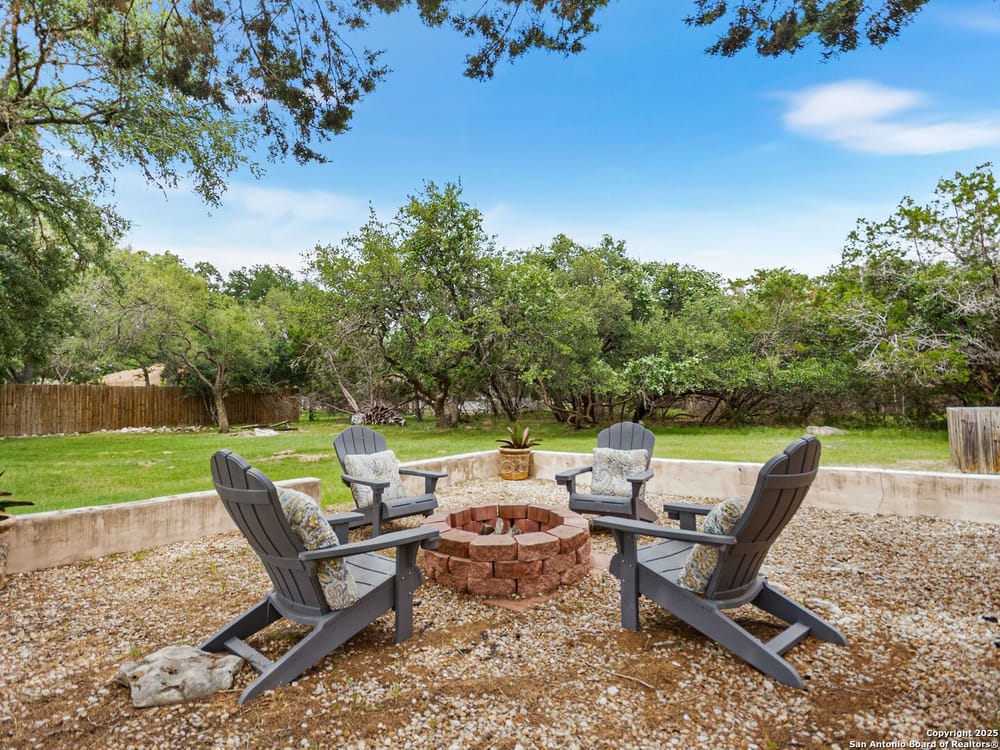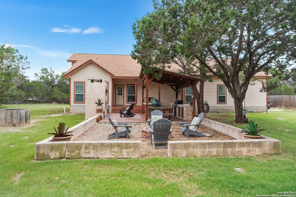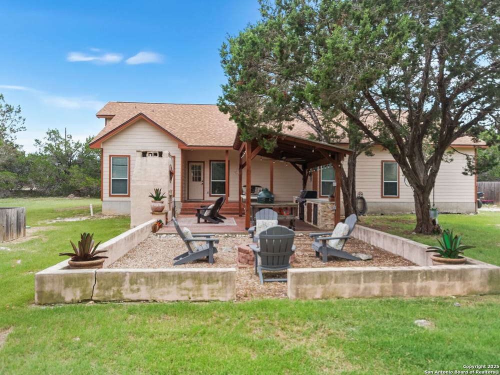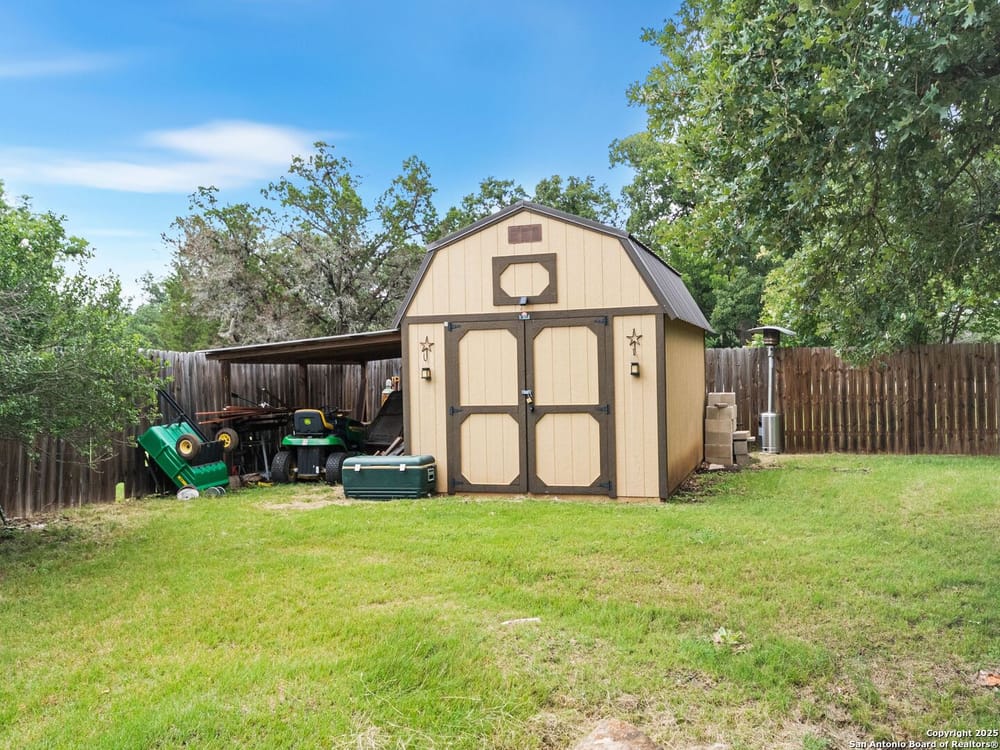 This home blends warmth, custom craftsmanship, and thoughtful design in an exceptional location! Nestled in the Rivermont neighborhood, residents enjoy exclusive access to a private park along the Guadalupe River, along with two neighborhood pools, a soccer field, pavilion, tennis courts, and basketball-creating a vibrant, outdoor-friendly community. Inside, the one-story layout is designed for both style and functionality, with no carpet, vaulted ceilings, stained wood doors, and rich wood accents throughout. Custom cabinetry enhances the character and quality of every space. The kitchen-anchored by a center island, built-in pantry, and granite countertops-is thoughtfully arranged for both everyday cooking and entertaining. The primary bath offers a luxurious retreat, featuring a separate jetted tub and shower, while the walk-in closet is completely custom, boasting a center island and built-in cabinetry for optimized clothing storage. Every detail speaks to craftsmanship and convenience. Stepping outside, the home continues to impress with a covered grilling area, a built-in outdoor fireplace, and a dedicated firepit space-ideal for year-round gatherings. A lofted storage shed provides extra utility, while an RV hookup and ample parking space accommodate adventure seekers who need room for boats or RVs. This home delivers both comfort and accessibility, seamlessly blending everyday practicality with elevated amenities.