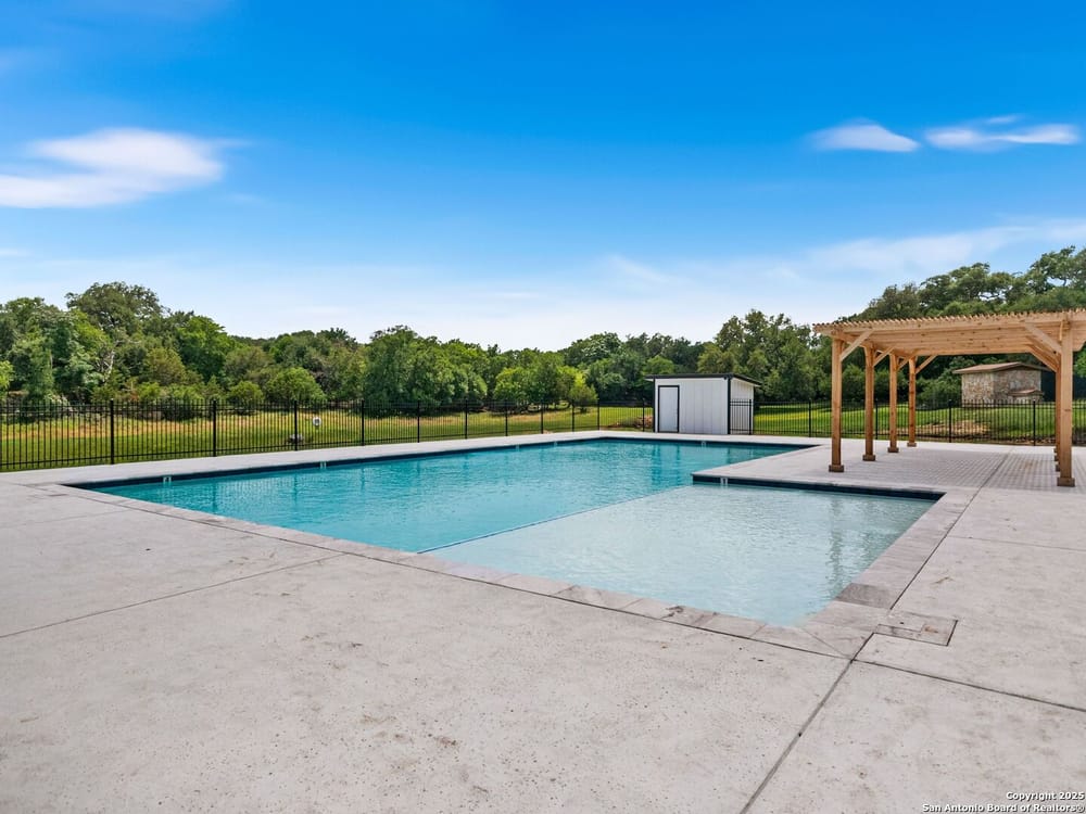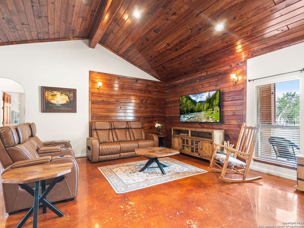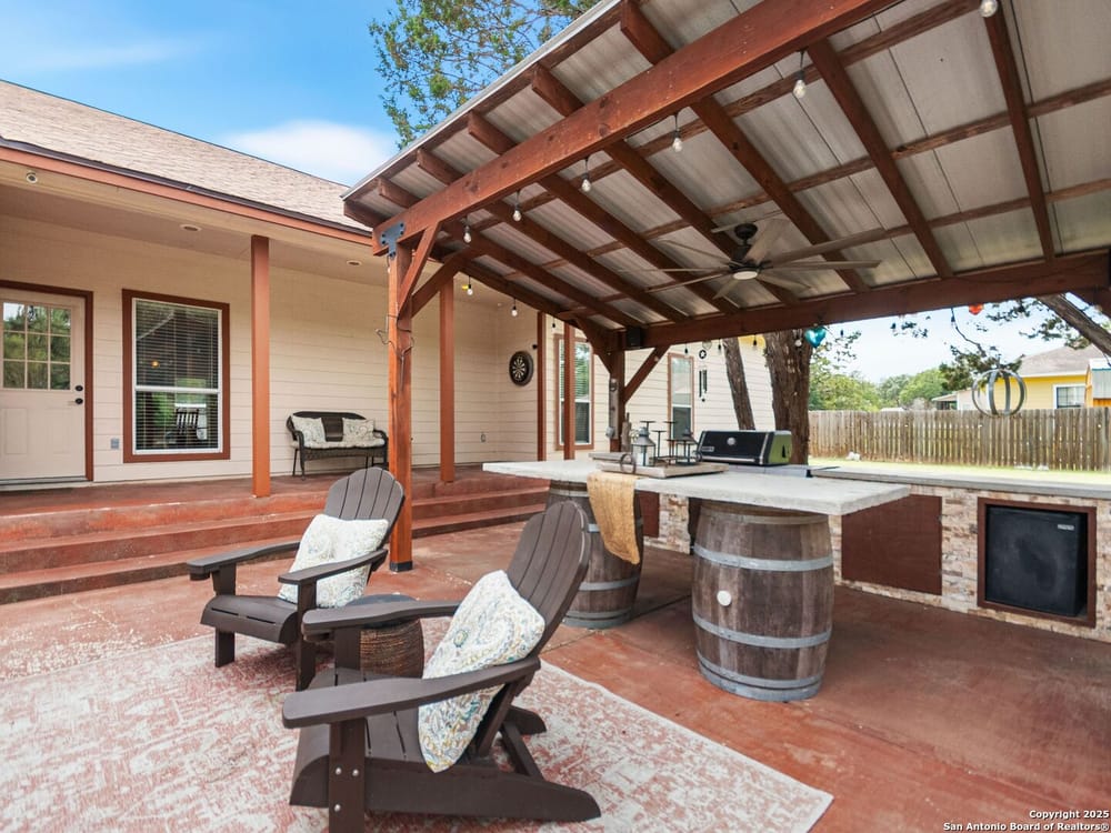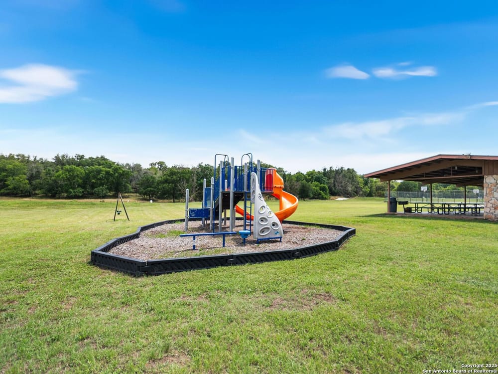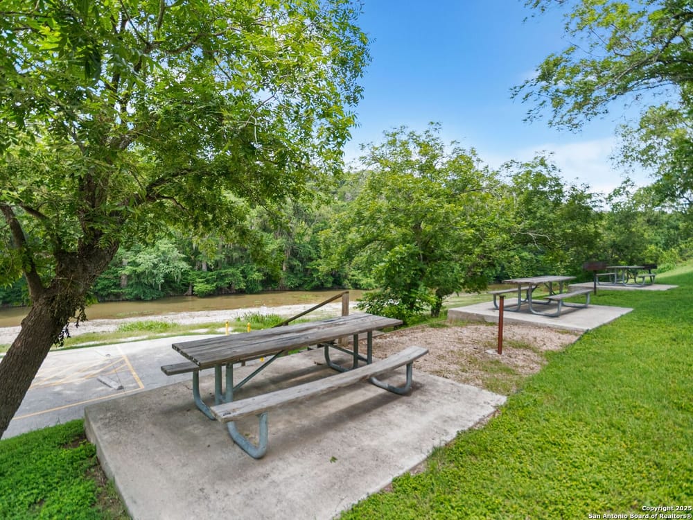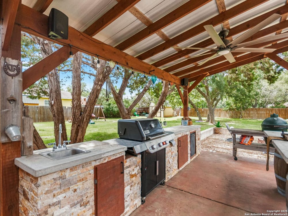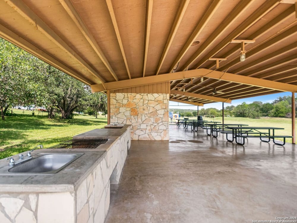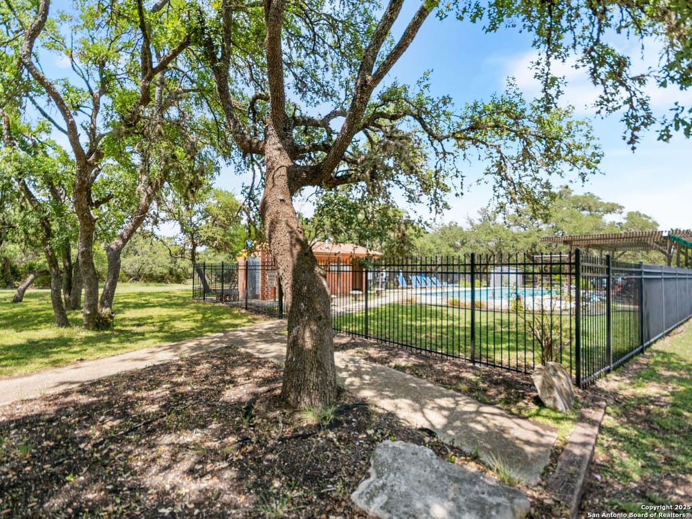 This home blends warmth, custom craftsmanship, and thoughtful design in an exceptional location! Nestled in the Rivermont neighborhood, residents enjoy exclusive access to a private park along the Guadalupe River, along with two neighborhood pools, a soccer field, pavilion, tennis courts, and basketball-creating a vibrant, outdoor-friendly community. Inside, the one-story layout is designed for both style and functionality, with no carpet, vaulted ceilings, stained wood doors, and rich wood accents throughout. Custom cabinetry enhances the character and quality of every space. The kitchen-anchored by a center island, built-in pantry, and granite countertops-is thoughtfully arranged for both everyday cooking and entertaining. The primary bath offers a luxurious retreat, featuring a separate jetted tub and shower, while the walk-in closet is completely custom, boasting a center island and built-in cabinetry for optimized clothing storage. Every detail speaks to craftsmanship and convenience. Stepping outside, the home continues to impress with a covered grilling area, a built-in outdoor fireplace, and a dedicated firepit space-ideal for year-round gatherings. A lofted storage shed provides extra utility, while an RV hookup and ample parking space accommodate adventure seekers who need room for boats or RVs. This home delivers both comfort and accessibility, seamlessly blending everyday practicality with elevated amenities.