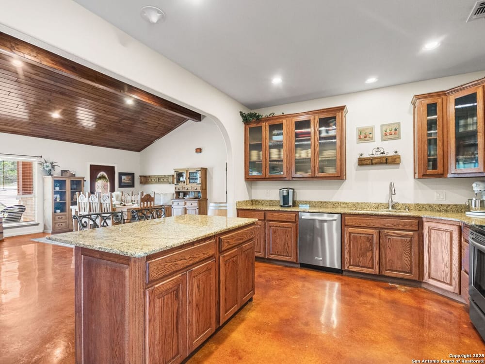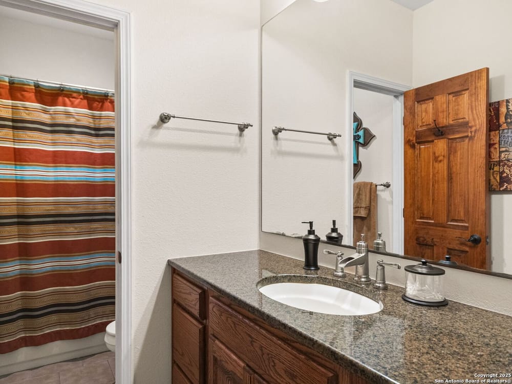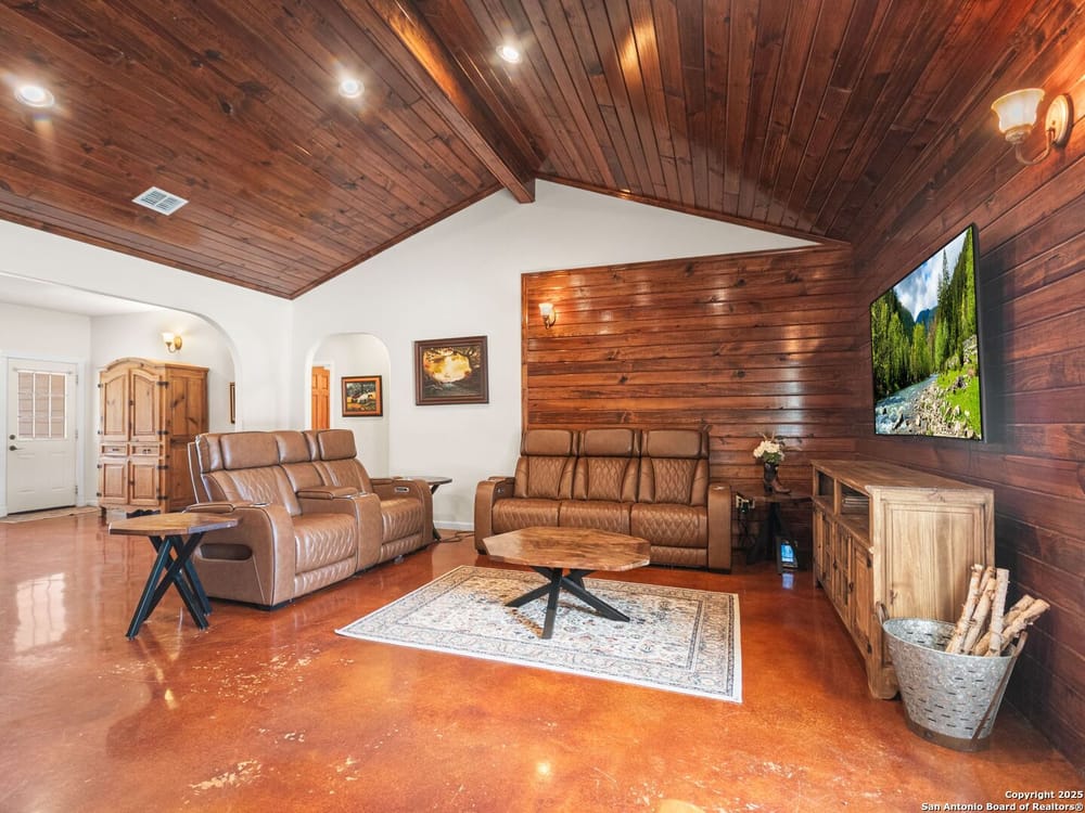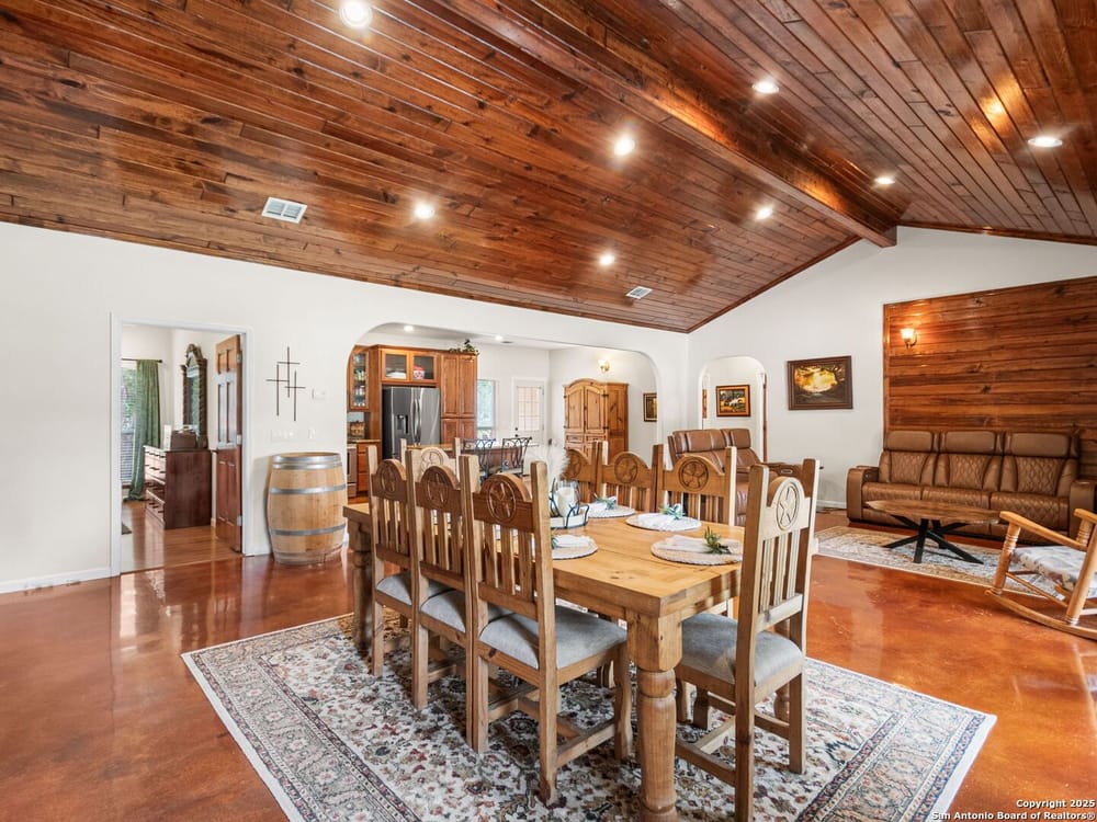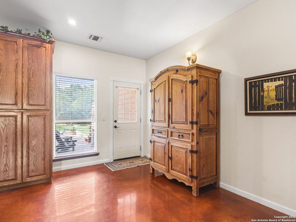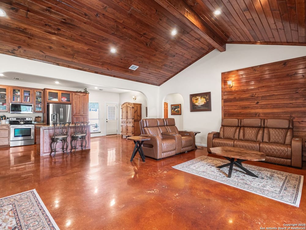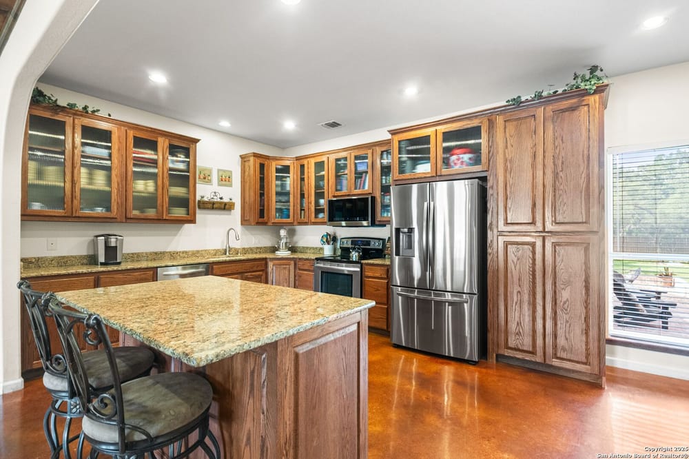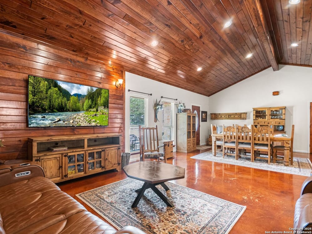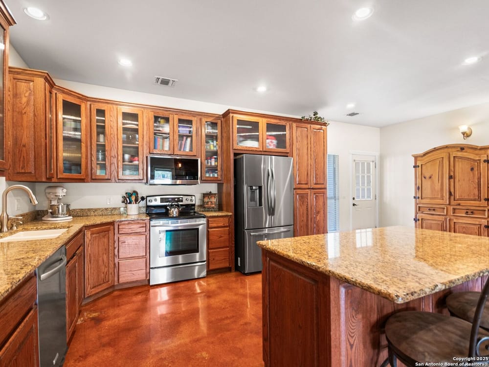 This home blends warmth, custom craftsmanship, and thoughtful design in an exceptional location! Nestled in the Rivermont neighborhood, residents enjoy exclusive access to a private park along the Guadalupe River, along with two neighborhood pools, a soccer field, pavilion, tennis courts, and basketball-creating a vibrant, outdoor-friendly community. Inside, the one-story layout is designed for both style and functionality, with no carpet, vaulted ceilings, stained wood doors, and rich wood accents throughout. Custom cabinetry enhances the character and quality of every space. The kitchen-anchored by a center island, built-in pantry, and granite countertops-is thoughtfully arranged for both everyday cooking and entertaining. The primary bath offers a luxurious retreat, featuring a separate jetted tub and shower, while the walk-in closet is completely custom, boasting a center island and built-in cabinetry for optimized clothing storage. Every detail speaks to craftsmanship and convenience. Stepping outside, the home continues to impress with a covered grilling area, a built-in outdoor fireplace, and a dedicated firepit space-ideal for year-round gatherings. A lofted storage shed provides extra utility, while an RV hookup and ample parking space accommodate adventure seekers who need room for boats or RVs. This home delivers both comfort and accessibility, seamlessly blending everyday practicality with elevated amenities.