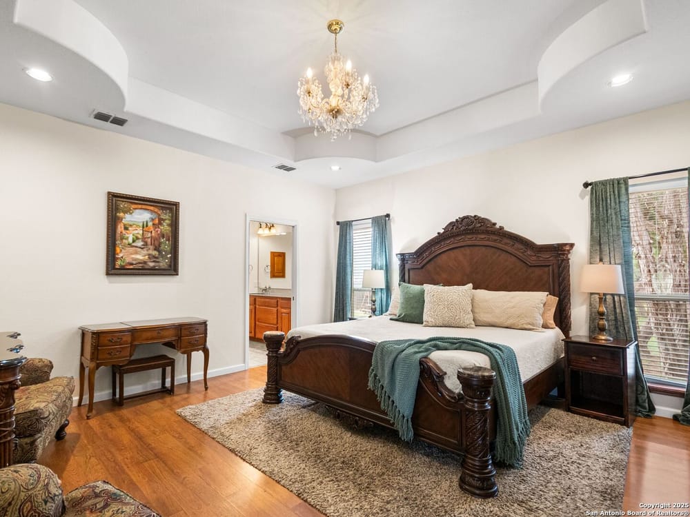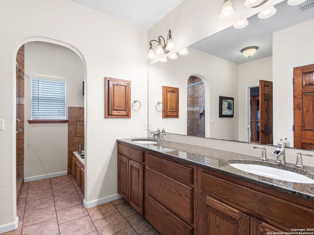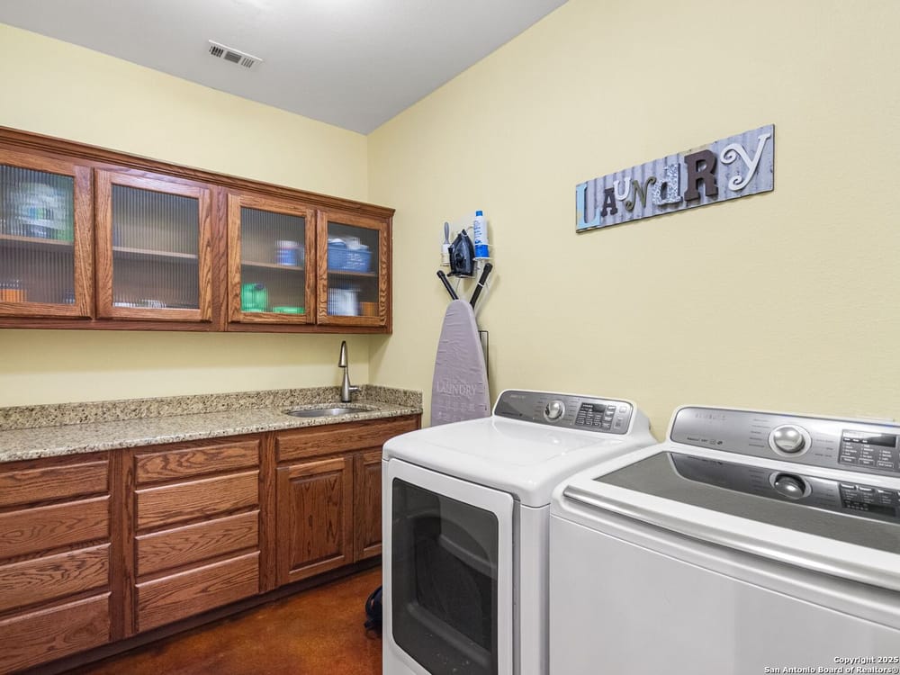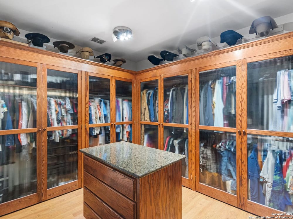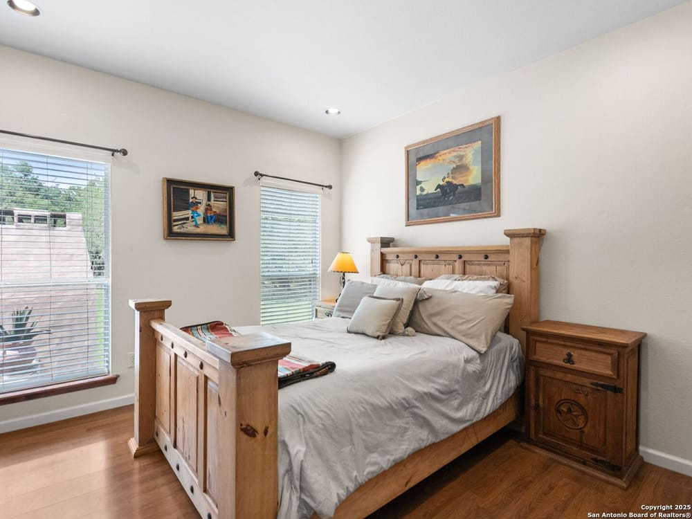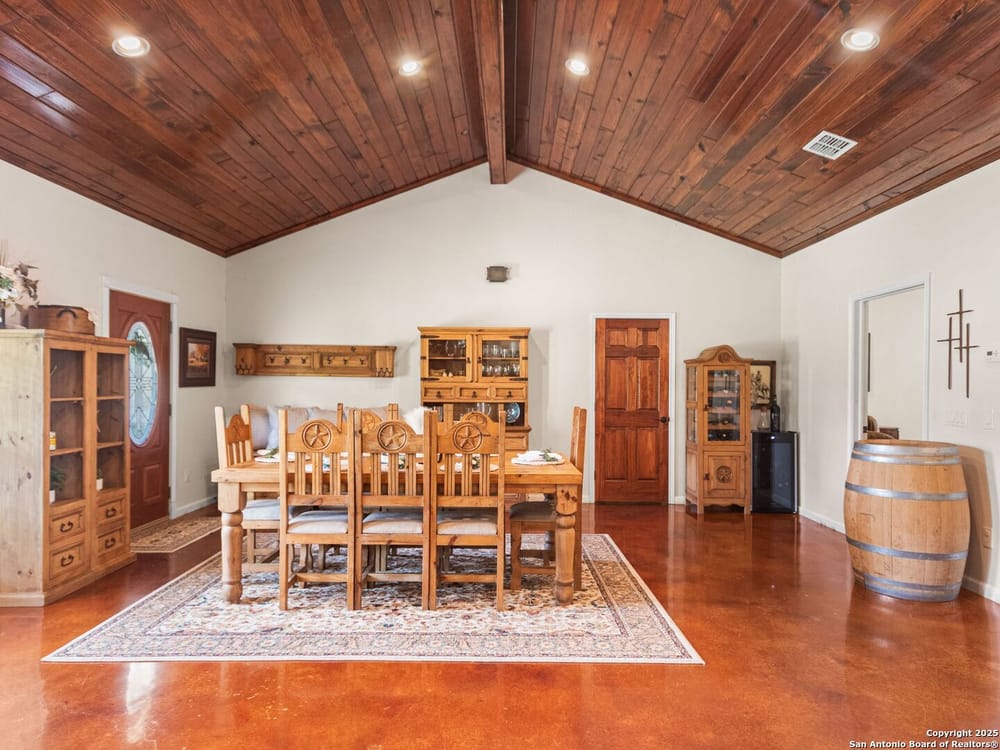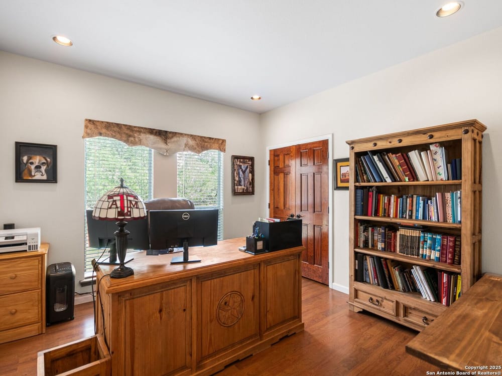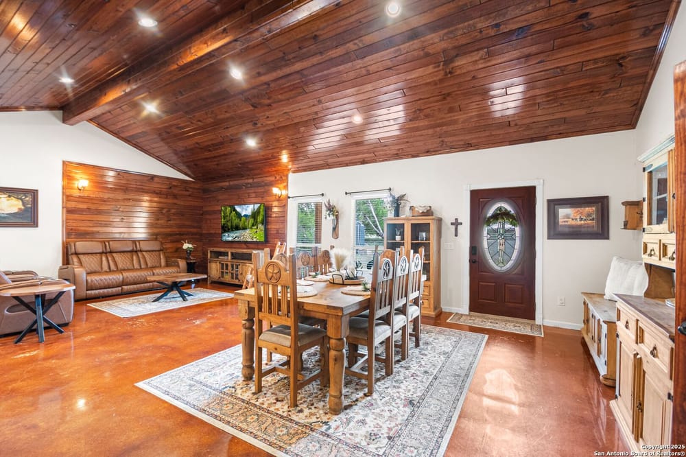 This home blends warmth, custom craftsmanship, and thoughtful design in an exceptional location! Nestled in the Rivermont neighborhood, residents enjoy exclusive access to a private park along the Guadalupe River, along with two neighborhood pools, a soccer field, pavilion, tennis courts, and basketball-creating a vibrant, outdoor-friendly community. Inside, the one-story layout is designed for both style and functionality, with no carpet, vaulted ceilings, stained wood doors, and rich wood accents throughout. Custom cabinetry enhances the character and quality of every space. The kitchen-anchored by a center island, built-in pantry, and granite countertops-is thoughtfully arranged for both everyday cooking and entertaining. The primary bath offers a luxurious retreat, featuring a separate jetted tub and shower, while the walk-in closet is completely custom, boasting a center island and built-in cabinetry for optimized clothing storage. Every detail speaks to craftsmanship and convenience. Stepping outside, the home continues to impress with a covered grilling area, a built-in outdoor fireplace, and a dedicated firepit space-ideal for year-round gatherings. A lofted storage shed provides extra utility, while an RV hookup and ample parking space accommodate adventure seekers who need room for boats or RVs. This home delivers both comfort and accessibility, seamlessly blending everyday practicality with elevated amenities.